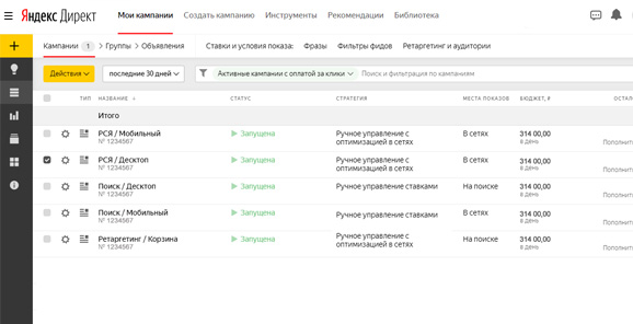 Для удобного управления ставками и комфортного отслеживания эффективности рекламы ее следуют разбивать по типу: Поиск, РСЯ и по устройствам на которых показывается реклама: десктоп, мобильное устройство.