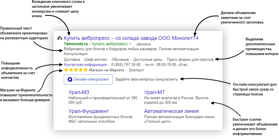 Для повышения показателей CTR и уменьшения стоимости клика мы создаем максимально эффективные объявления. Заголовки наших объявлений соответствуют запросам пользователей.